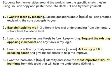Many students are already integrating AI into the learning process. Recent data from OpenAI reveals that students are using ChatGPT to prepare for assessments in a variety of ways, with chats ranging from simple topic explanations to motivational prompts. While students clearly seek this kind of individualized learning, faculty guidance can help shift the experience from trial-and-error experimentation to purposeful practice.